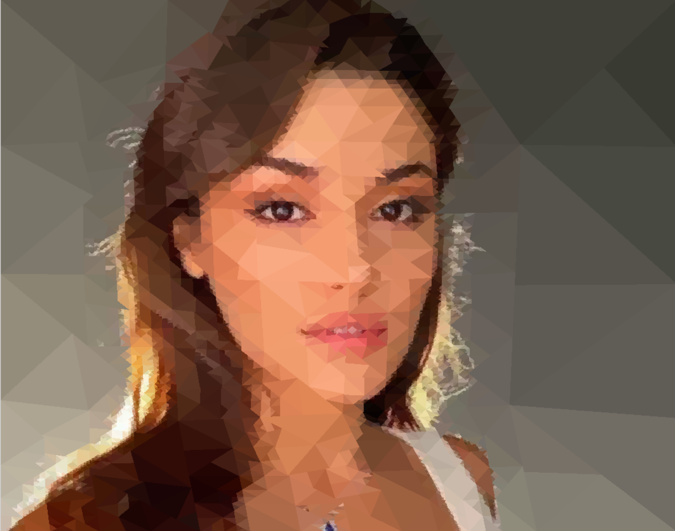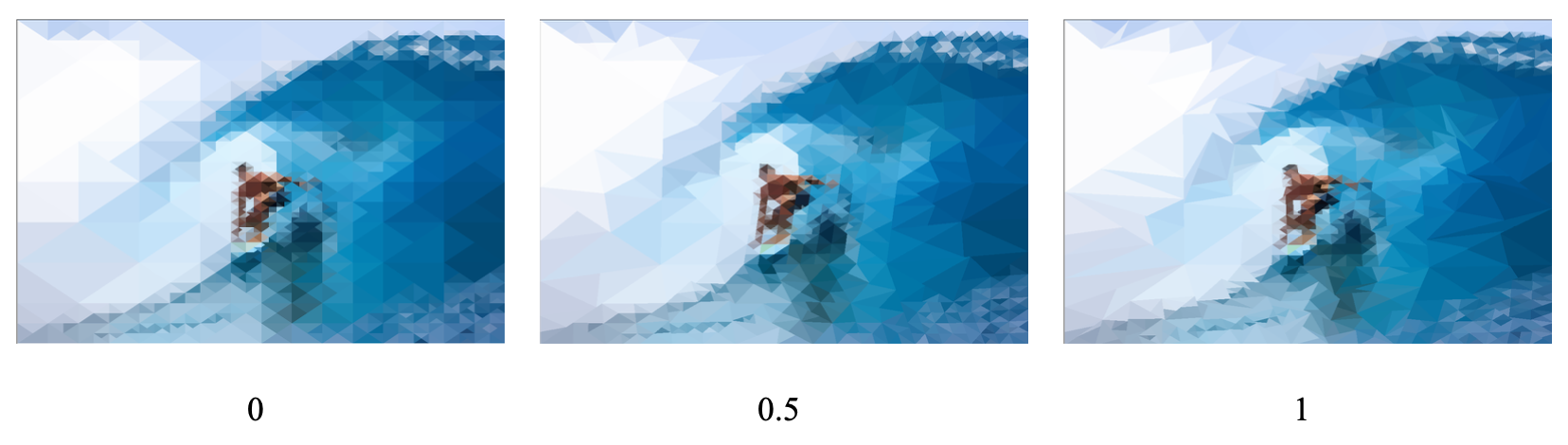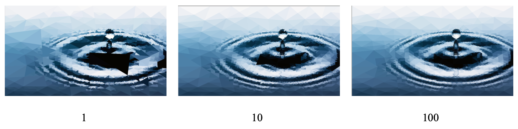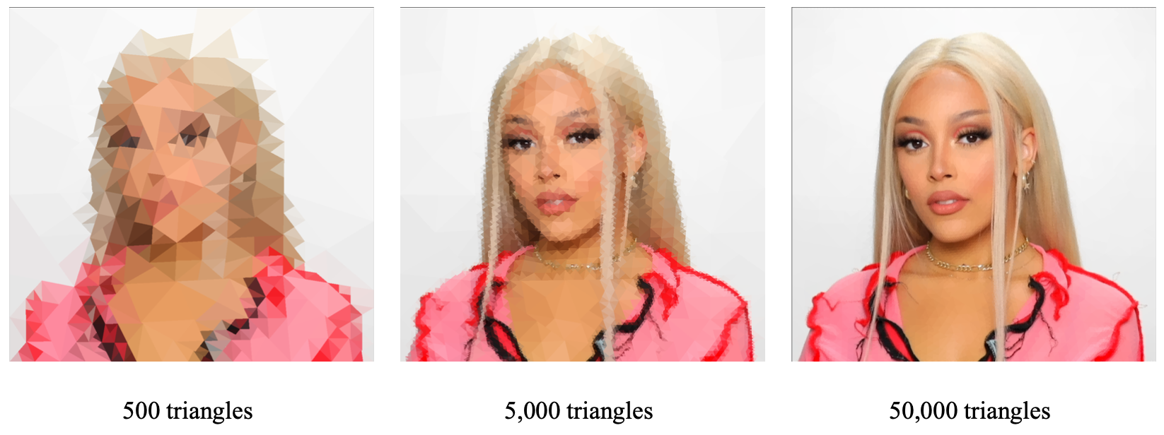 As you increase the number of triangles, there is more detail preserved in the final image. With a few hundred triangles, you get a cool mosaic pattern, with a few thousand you get a stylized low-poly version of the original photo, and with tens of thousands of triangles, you get a pretty close approximation of the original image.