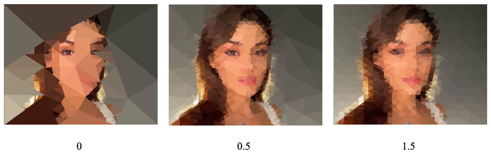 Area priority affects which triangles are chosen to be split. With a value of 0, the algorithm always chooses the triangle that is covering the most detailed part of the image. That’s why most of the triangles are used near the eyes but almost none are used for the gray background. As the value is increased, larger triangles will be prioritized to be split even if they don’t cover as much detail. I found 0.5 to be a good compromise between prioritizing detail and maintaining a homogenous look over the whole image.