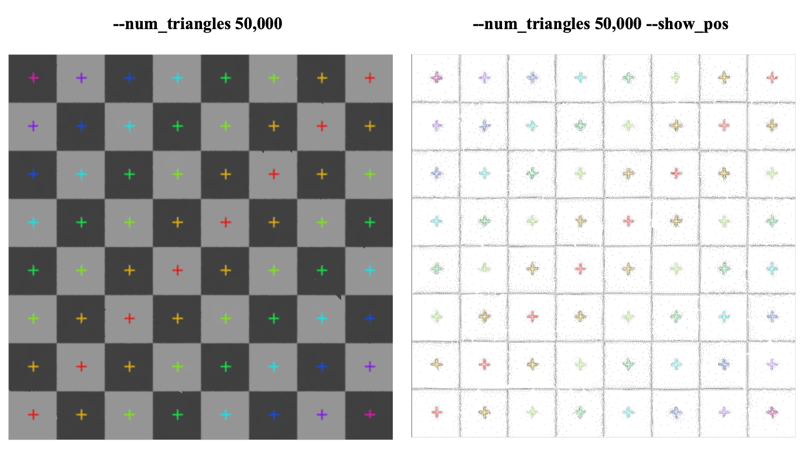 --show_pos (null) Instead of plotting triangles, the centroid of each triangle is plotted. This makes it very easy to visualize the distribution of triangles and where the algorithm thinks there is more detail in the image.